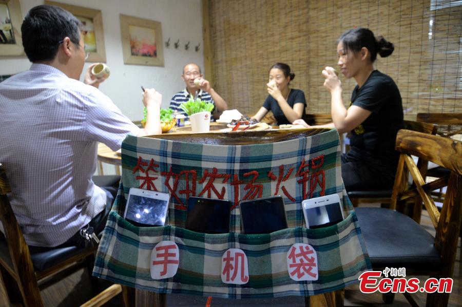 The mobile phones of customers are put inside bags at a hot pot restaurant in Handan city, North China’s Hebei province. The restaurant manager says the measure aims to remind customers to focus on food and their friends or family members while eating at the establishment, instead of staring at their phones. (Photo: China News Service/Hao Qunying)
