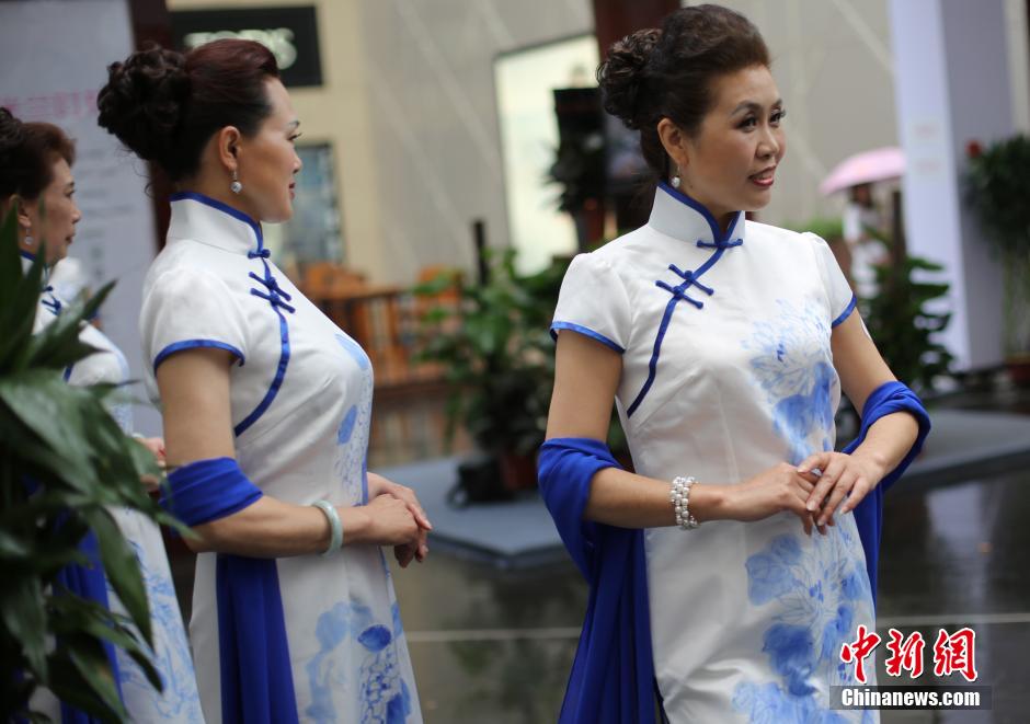 A model team composed of middle-aged women in cheongsams performs in the show with the theme of “Nanjing Week at the Expo Milano”