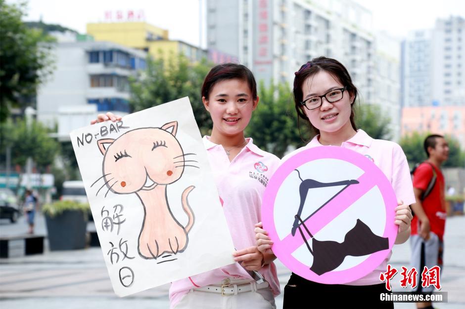 To mark the No Bra Day, volunteers call the public to pay attention to the breast health in Chengdu, southwest China's Sichuan province on July 9, 2015. Research indicates that wearing bra may increase the risks of getting breast cancer for a woman. (CNS/Liu Yanjun)