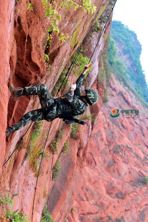 54 special operations soldiers from Jiangsu armed police corps attend a field comprehensive drill in Nanjing on July 8, 2015. They successfully completed a series of training subjects, such as 10 km long-range raid, rock climbing, rope descending and wading. (Photo/www.81.cn)