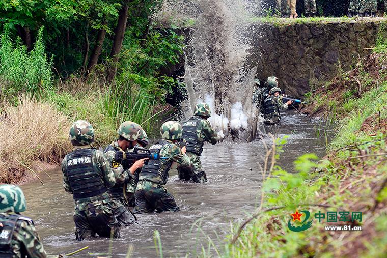 54 special operations soldiers from Jiangsu armed police corps attend a field comprehensive drill in Nanjing on July 8, 2015. They successfully completed a series of training subjects, such as 10 km long-range raid, rock climbing, rope descending and wading. (Photo/www.81.cn)