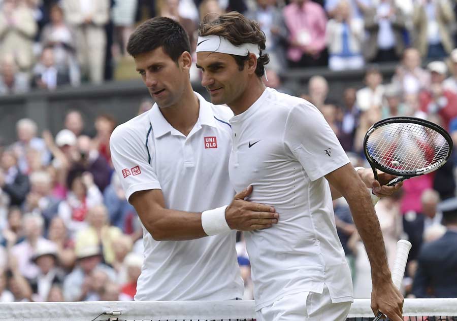 Novak Djokovic of Serbia embraces Roger Federer of Switzerland after winning their Men's Singles Final match at the Wimbledon Tennis Championships in London, July 12, 2015. [Photo/Agencies]