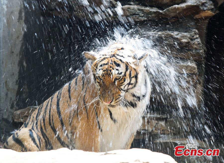 | A tiger plays with water at a zoo in Ji’nan, capital of East China’s Shandong province, July 13, 2015. Zoo keepers have tried numerous methods, such as providing water or watermelons, to help animals cope with the high temperatures that have reached 38 degrees Celsius. (Photo: China News Service/Zhang Yong) |
