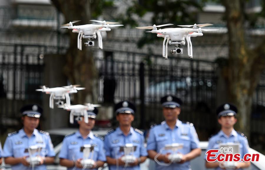 Policemen control UAVs (unmanned aerial vehicles) during the launch ceremony of a UAV task force in Nanjing city, capital of East China’s Jiangsu province, July 14, 2015. The Xuanwu bureau of the Nanjing Police have started using UAVs to aid supervision at large-scale events, in emergency responses, to search for suspects, and in rescue missions. (Photo: China News Service/Yang Weibin)