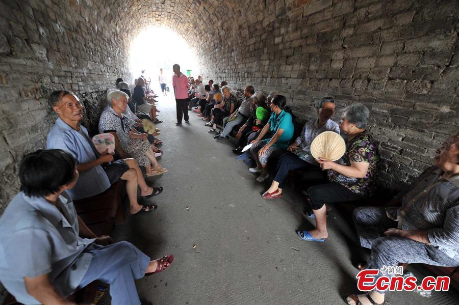 Residents shelter from the scorching sun under an old city gate in Changting county, East China’s Fujian province, July 14, 2015. The city gate’s entrance tunnel is 8.55 meters long and the arch is 3.4 meters high. It's a popular place for senior citizens to keep cool on hot days. Changting is a city originally built in the Tang Dynasty (618-907). (Photo: China News Service/Zhang Bin)