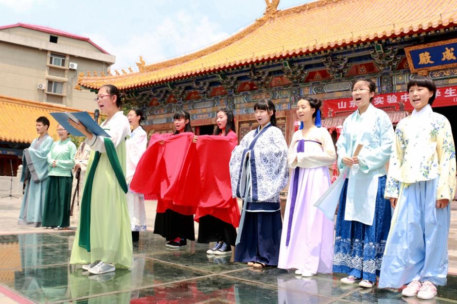 High school students in Hanfu clothing perform in a talent show in Confucian Temple on July 12, 2015 in Jinan, Shandong province.