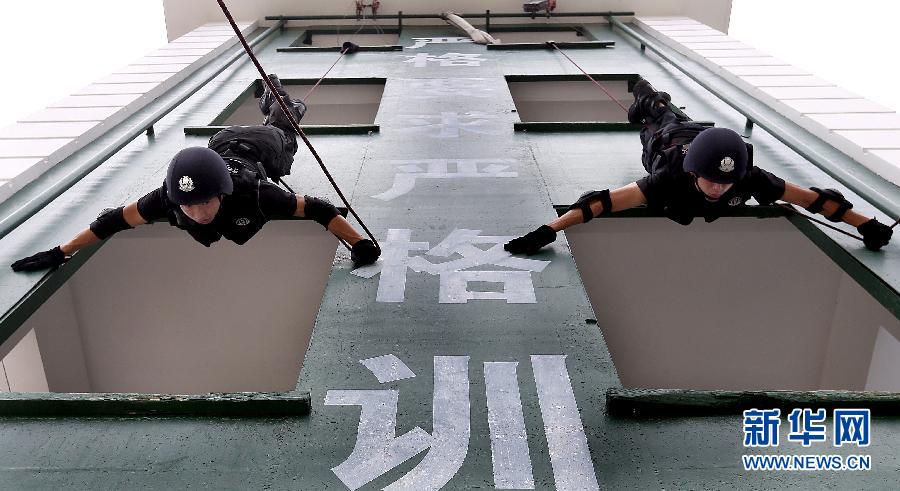 The SWAT team of Fengxian District Branch, Shanghai Municipal Public Security Bureau trains on July 14, 2015. (Xinhua/Fan Jun)