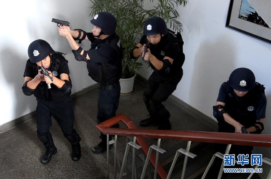 The SWAT team of Fengxian District Branch, Shanghai Municipal Public Security Bureau trains on July 14, 2015. (Xinhua/Fan Jun)