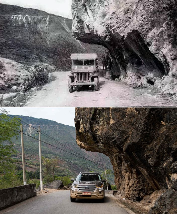 Combo photos present the past and present of the Yunnan-Myanmar Road, which is also called "burma road",a road linking Myanmar with the southwest of China.It represented an important historical witness of anti-Japanese facts in the World War II.Some parts of the old road are still visible today. (Photo/ Xinhua)
