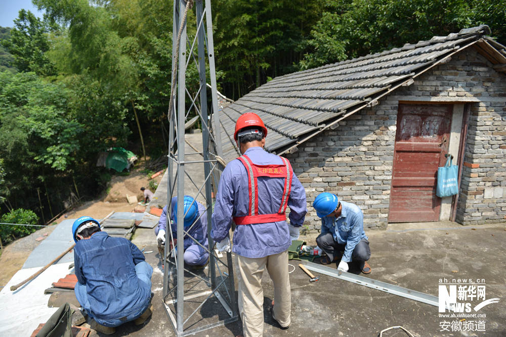 Workers of an electric power company in the front line on July 13, 2015 in Jinzhai, Anhui Province. (Photo/Xinhua)