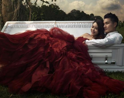 Like everyone else, the bride Jenny Tay wears red and white wedding gowns and the groom Darren Cheng wears a tuxedo when posing for the wedding photos. What's different is that there is a white coffin in most of the photos.