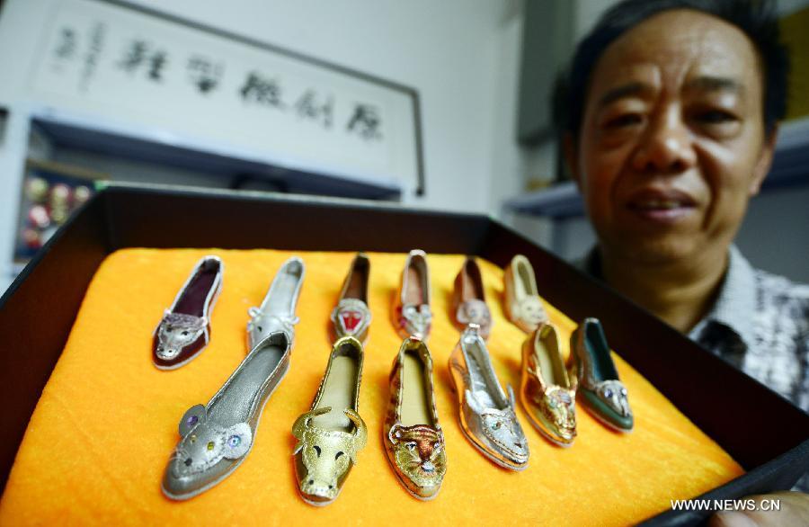 Peng Shizeng, a 55-year-old shoe designer, shows his mini shoe creations at a cultural and creative park in Jinan, capital of east China's Shandong Province, July 16, 2015. Peng started making the mini shoes since 2013, aiming at to attract more attention on this art. (Xinhua/Zhao Xiaoming)