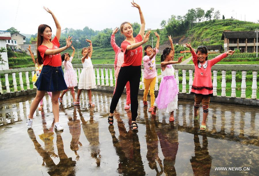 Volunteers from University of South China teach left-behind children dance in Qunshan village elementary school, township of Gutang, Lianyuan city, east China's Hunan Province, July 16, 2015. (Xinhua/Cao Zhengping)