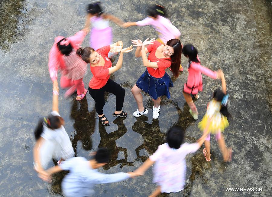 Volunteers from University of South China teach left-behind children dance in Qunshan village elementary school, township of Gutang, Lianyuan city, east China's Hunan Province, July 16, 2015. (Xinhua/Cao Zhengping)
