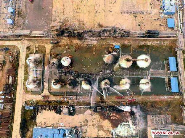 Photo taken on July 17, 2015 shows the scene where a fire has been extinguished at a petrochemical plant in Rizhao, east China's Shandong Province. A fire that engulfed a petrochemical plant in east China's Shandong Province on Thursday morning has been put out, and no casualties have been reported except two injured firefighters. (Xinhua)