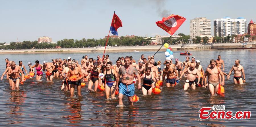 Participants from China swim across the Heilong River in Heihe city, Northeast China’s Heilongjiang province, July 16, 2015. About 230 people from China and Russia attended the activity, the 13th of its kind, held in Heihe and the city of Bulageweishensike, Russia to swim across the border river. (Photo: China News Service/Liu Liming)