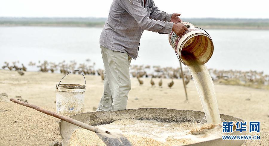 A farmer uses water fetched from the polluted Duliujian River to prepare fodder for ducks in Tianjin municipality, July 16, 2015. The river, which runs for 67 kilometers, is a major flood diversion project that runs through several regions in Tianjin, and it provides water for the Beidagang Wetland, a significant habitant for migratory birds in East Asia. Companies based along the river's banks have been polluting its waters for ten years. Residents living near the river complain about the bad smell, diminished harvests, and suspicious deaths of poultry. (Photo/Xinhua)