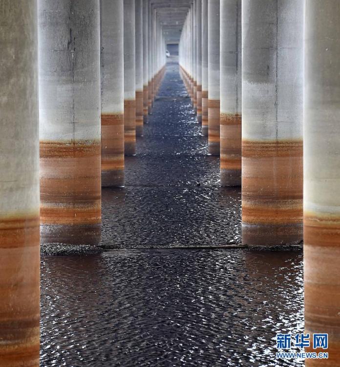 Bridge piers turn yellow as polluted water from the Duliujian River flow by in Tianjin municipality, July 9, 2015. The river, which runs for 67 kilometers, is a major flood diversion project that runs through several regions in Tianjin, and it provides water for the Beidagang Wetland, a significant habitant for migratory birds in East Asia. Companies based along the river's banks have been polluting its waters for ten years. Residents living near the river complain about the bad smell, diminished harvests, and suspicious deaths of poultry. (Photo/Xinhua)