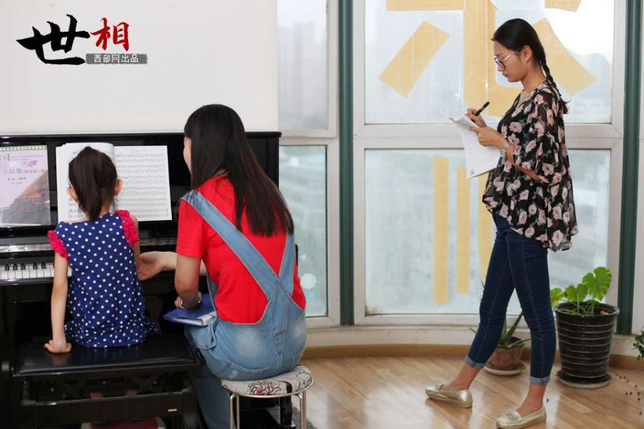 Zhang Wenjin takes notes in a piano class in her music training center. (cnwest.com/Wei Yongxian)