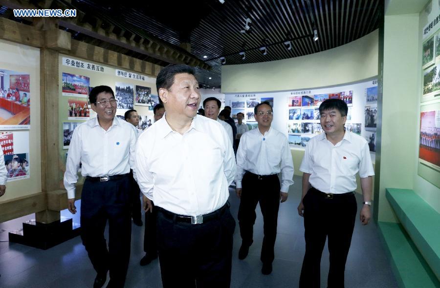 | Chinese President Xi Jinping (front) visits an exhibition about the development of Yanbian in Yanbian Korea Autonomous Prefecture, northeast China's Jilin Province, July 16, 2015. Xi made an inspection tour in Jilin from July 16 to 18. (Xinhua/Ju Peng) |