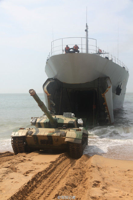 On July 17, a beach in southern Fujian Province in China encountered gusty wind and high waves. The Nanjing Military Command and a navy warship division worked together to organize a training session in heavy equipment unloading. (Photo by Ding Zhenlei)