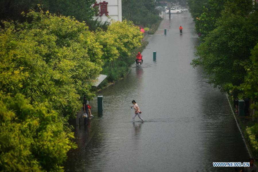 Photo taken on July 19, 2015 shows a water-logged road in Tianjin, north China. Tianjin Weather Station issued yellow alerts for rainstorm, thunder and lightning on Sunday afternoon. (Xinhua/You Sixing)