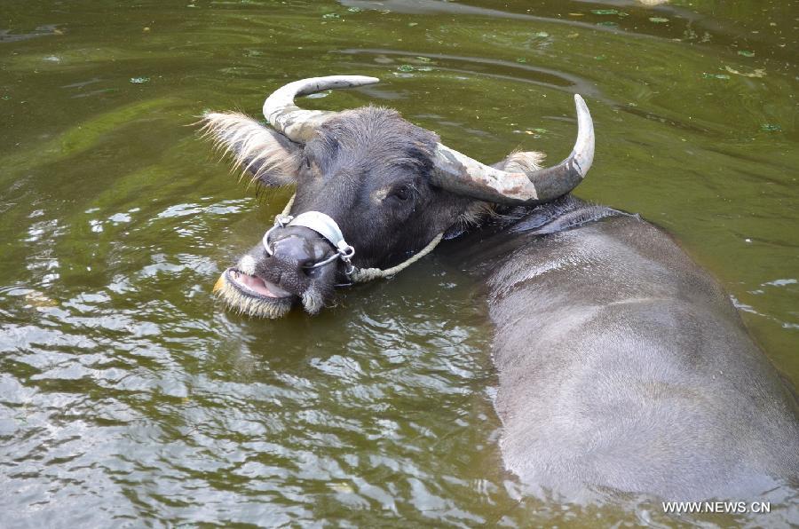 A buffalo goes underwater to cool itself at the Taipei Zoo in Taipei, southeast China's Taiwan, July 19, 2015. Taipei Zoo gave animals some special cooling treats due to the weather these days. (Xinhua)