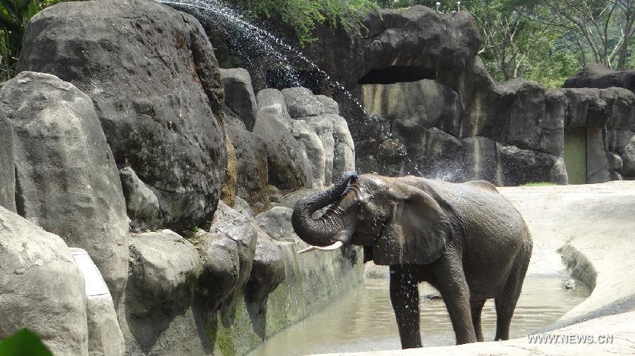 An elephant plays in water to cool itself at the Taipei Zoo in Taipei, southeast China's Taiwan, July 19, 2015. Taipei Zoo gave animals some special cooling treats due to the weather these days. (Xinhua)
