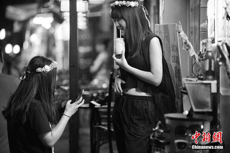 Two girls are drinking yogurt while waiting grilled squid in Nanluoguxiang of Beijing. As one of the most visited tourist destination in Beijing, Nanluoguxiang are very lively in the night with all kinds of snacks.