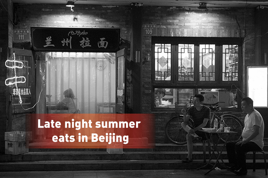 Two men are sitting outside the restaurant and enjoying skewers and beer at night of Beijing.