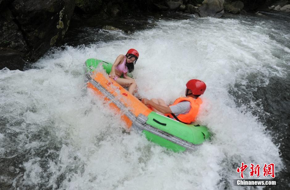 Charming bikini lifeguards appear in the river rafting place in Lianyunshan Mountain in Pingjiang, central China’s Hunan province on July 19, 2015. Those bikini girls sit with tourists in the same raft to protect their safety. (CNS/Yang Huafeng)