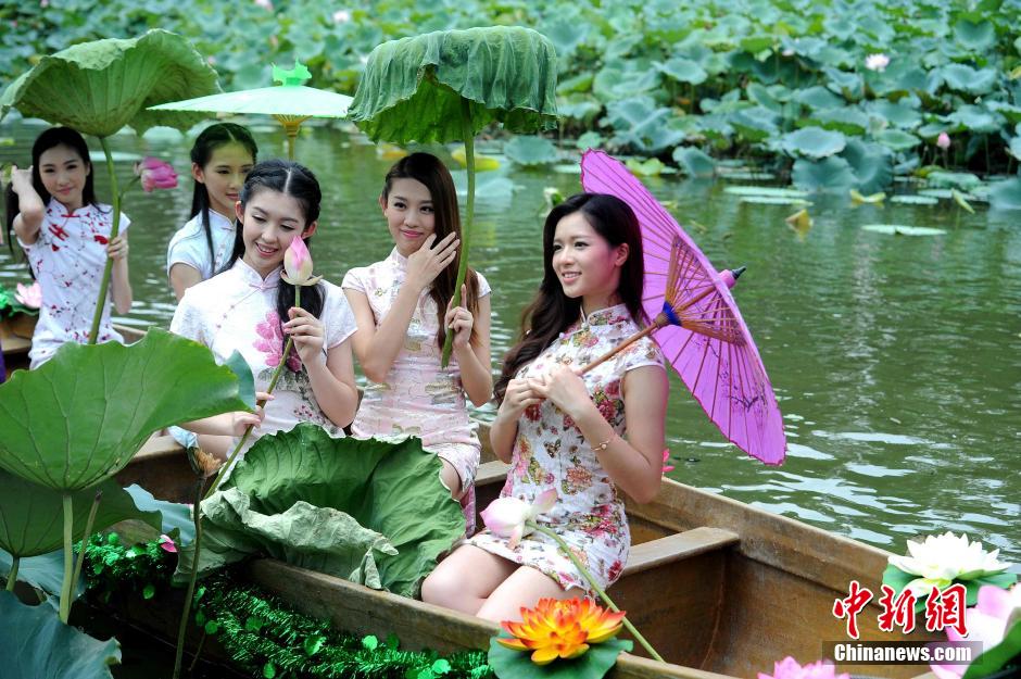On July 19, top 10 candidates in cheongsam for 2015 Zhujiang image ambassador row boats in a lotus pond and seem like China’s “l(fā)otus fairy”. (CNS/Cui Yukun)