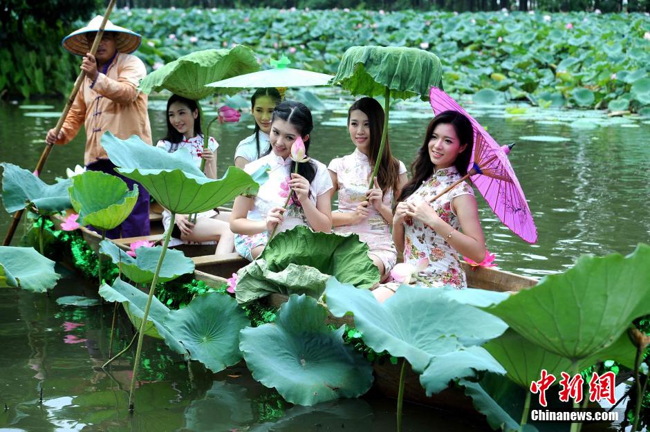 On July 19, top 10 candidates in cheongsam for 2015 Zhujiang image ambassador row boats in a lotus pond and seem like China’s “l(fā)otus fairy”. (CNS/Cui Yukun)