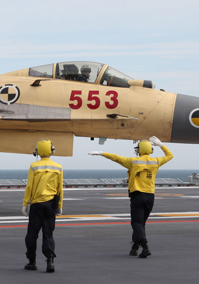 A group of photos show the training scene of the soldiers serving at Liaoning aircraft carrier. Their hand signals when directing the aircrafts make the legend 'aircraft carrier style' popular on the internet with many people posting imitations of it. (Photo/China Youth Daily)