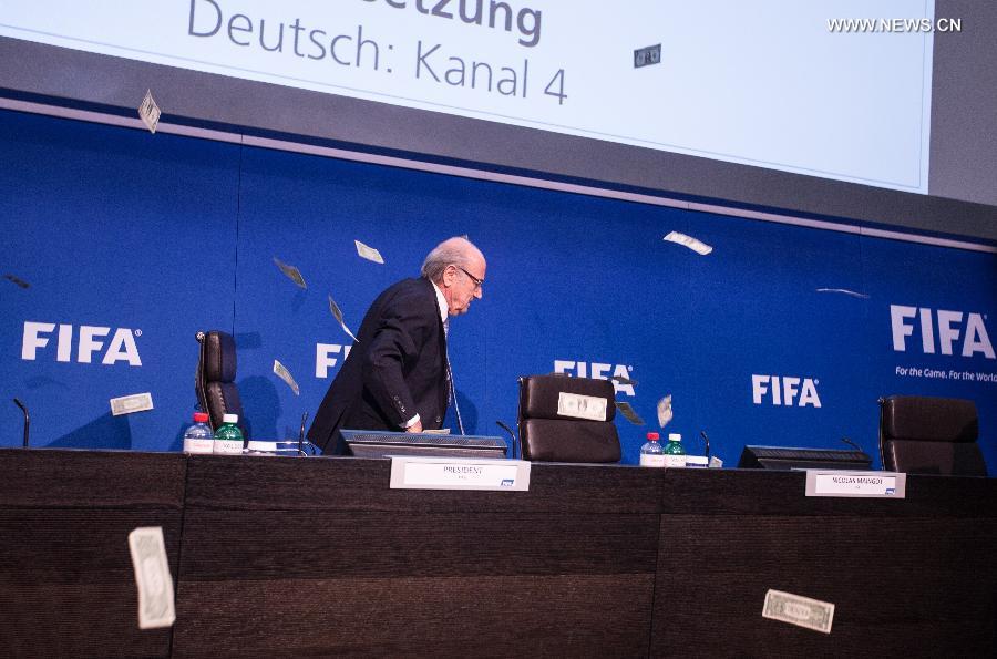ZURICH, July 20 -- Sepp Blatter, president of Federation Internationale de Football Association (FIFA) on Monday afternoon was showered with fake U.S. dollars when he was about to unveil FIFA' s reform plan at press conference.
