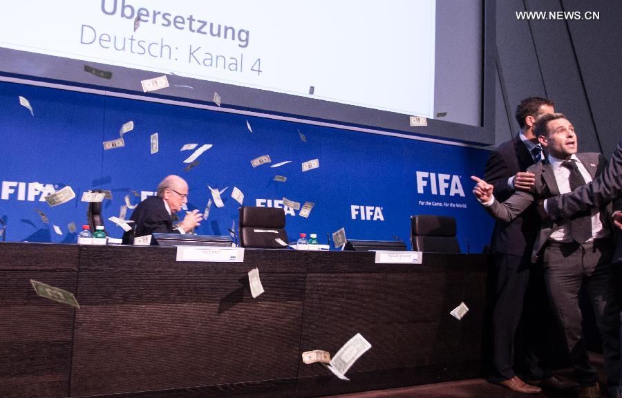 ZURICH, July 20 -- Sepp Blatter, president of Federation Internationale de Football Association (FIFA) on Monday afternoon was showered with fake U.S. dollars when he was about to unveil FIFA' s reform plan at press conference.