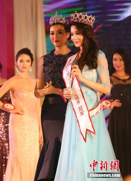 Hu Yanliang (L), winner of Miss Universe China 2014, poses with Lang Zhennan (R), winner of Miss Universe China Beijing Final 2015, during the Beijing regional final of the 2015 Miss Universe China Pageant in Beijing, July 19, 2015. (CNS/Ren Haixia)