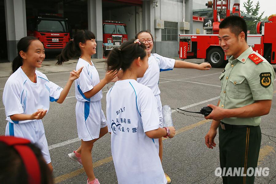 Students get along well with the firemen, July 21, 2015. (Wang Zibin/Qianlong.com)