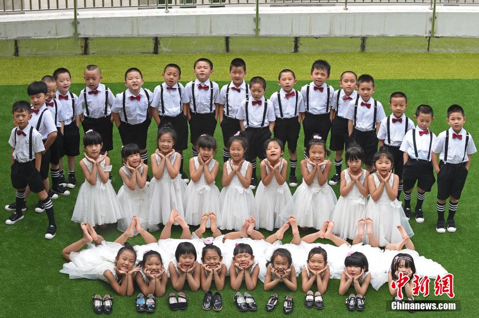 Girls and boys pose for kindergarten graduation photos in Taiyuan, north China’s Shanxi province on July 21, 2015. (CNS/Wu Junjie)