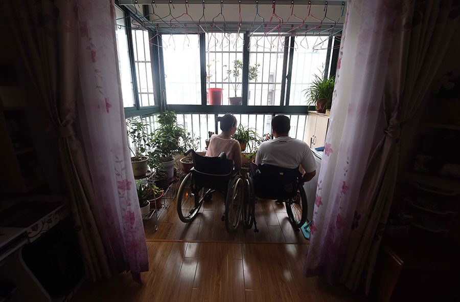 Qian Jun (R) and Xu Wenxiu (L) chat with each other on the balcony. (Xinhua/Xie Chen)