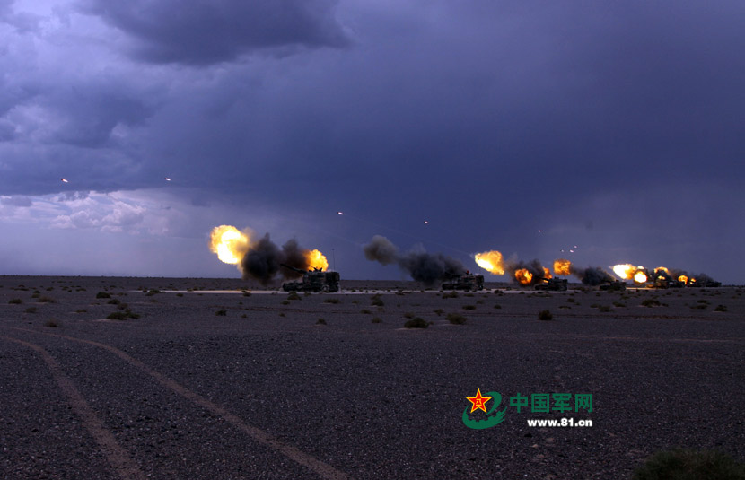 A new-type self-propelled gun fires in a live fire drill held by the 1st Group Army in the desert on July 21, 2015. (Photo/www.81.cn)