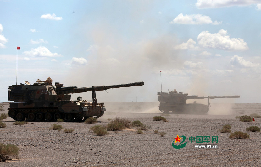 | A new-type self-propelled gun fires in a live fire drill held by the 1st Group Army in the desert on July 21, 2015. (Photo/www.81.cn) |