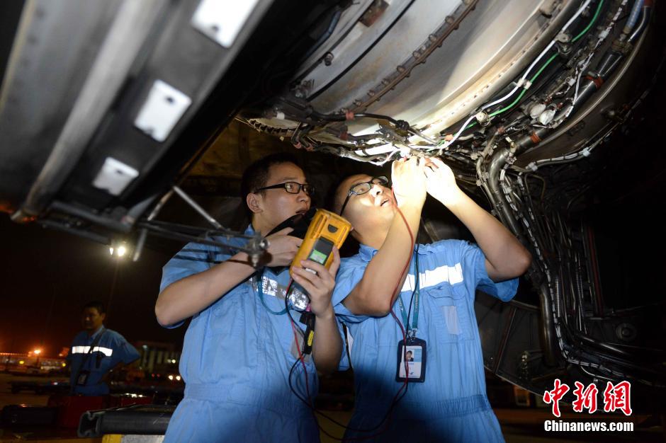 Maintenance engineers check a plane. (CNS/Wang Dongming)
