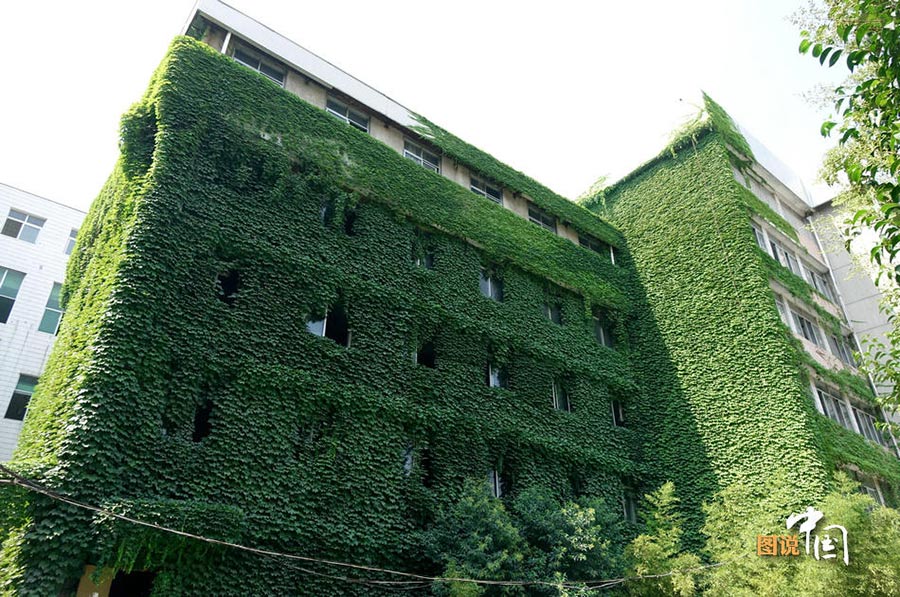 School building, office building of Zhengzhou No. 44 Middle School in Zhengzhou, Henan province are covered by vines, which is as high as five or six floors. The temperature inside the building is at least 5 degrees Celsius lower than other buildings. (Photo / CCTV)