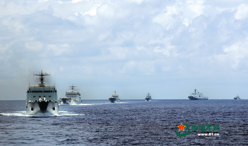 A landing ship division of the South China Sea Fleet, a marine brigade, a navy aviation unit, an amphibious armored force and other units jointly conduct a transportation drill in middle July 2015. (Photo/www.81.cn)