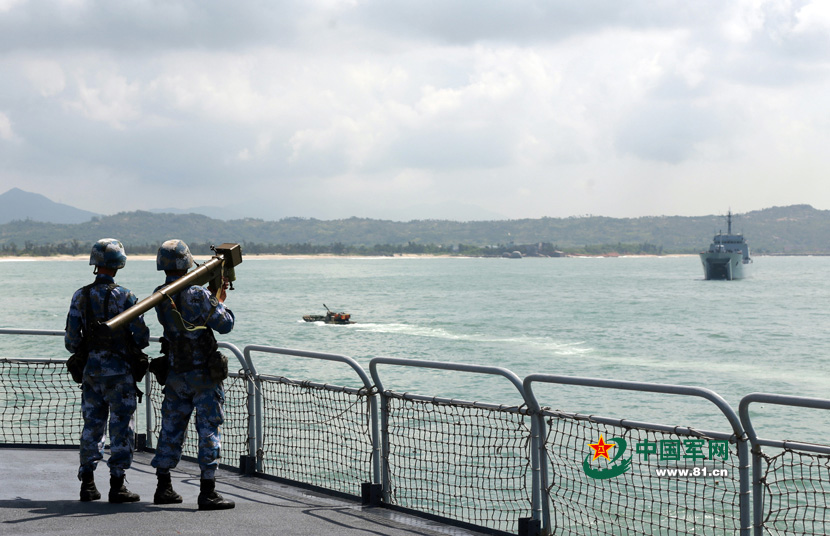 A landing ship division of the South China Sea Fleet, a marine brigade, a navy aviation unit, an amphibious armored force and other units jointly conduct a transportation drill in middle July 2015. (Photo/www.81.cn)