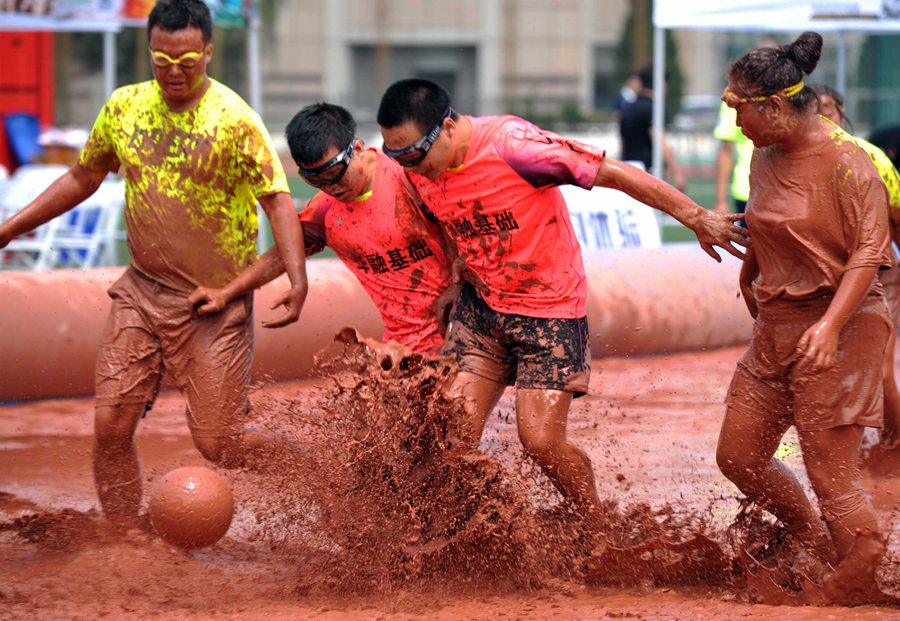 A mud football match is held in Beijing on July 23. (Photo/ Xinhua)