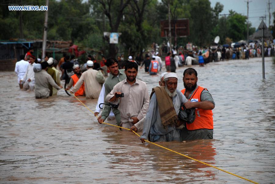 People walk through flooded area in northwest Pakistan's Peshawar on July 26, 2015. At least 43 people were killed, hundreds of others injured and tens of thousands displaced in flooding and rain-related accidents in Pakistan's Punjab, Khyber Pakhtunkhwa and Balochistan, local media and officials said Saturday. (Xinhua/Umar Qayyum)