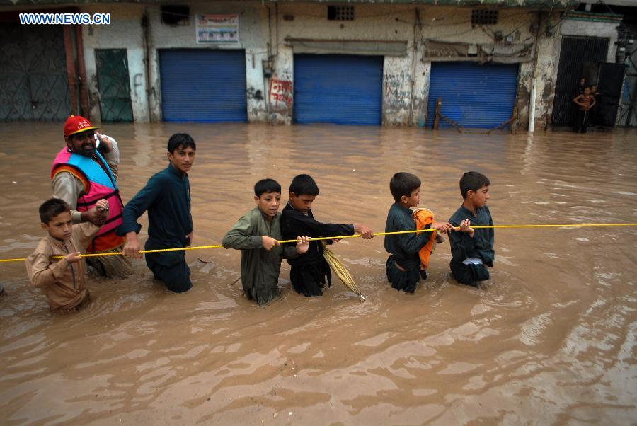 Pakistani boys hold a rope as they walk through flooded area in northwest Pakistan's Peshawar on July 26, 2015. At least 43 people were killed, hundreds of others injured and tens of thousands displaced in flooding and rain-related accidents in Pakistan's Punjab, Khyber Pakhtunkhwa and Balochistan, local media and officials said Saturday. (Xinhua/Umar Qayyum)