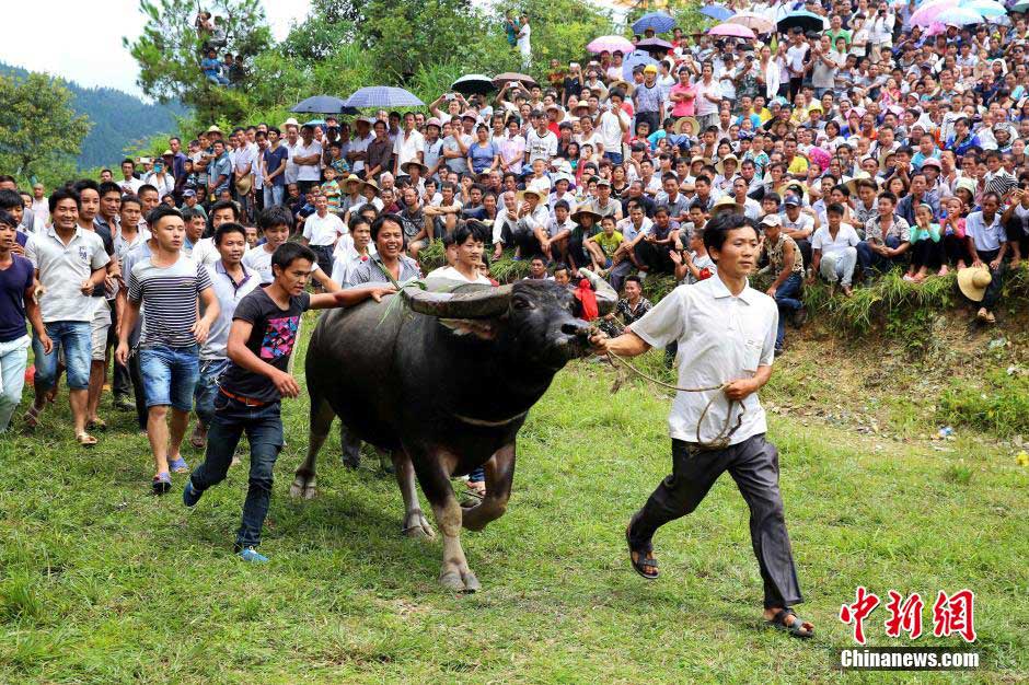 Miao people (Miao, an ethnic minority of China) celebrate traditional “Chixin Festival” in Rongjiang county, southwest China’s Guizhou province on July 22, 2015. A bull fighting competition was held for celebration. (CNS/Li Changhua)